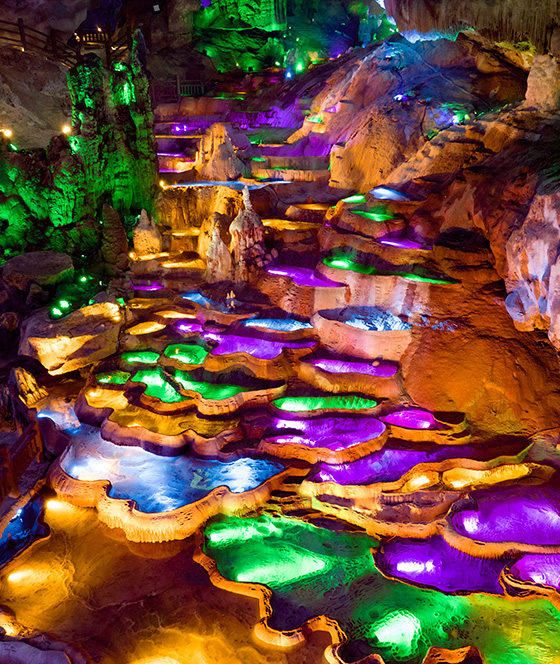 眼前五彩斑斓,错落有致的仙池是喀斯特地貌中特有的景观,学名钙化池,因地下水富含钙离子,水流缓慢,随着水从洞穴中逐渐渗出,水中的二氧化碳迅速消失,失去了二氧化碳的碳酸氢钙就变成了不溶于水的碳酸钙,就地沉积下来,随着时间的推移,逐渐形成了第一道拦水坝——边石坝。当泉水越过这道边石坝,流向下一个地面突起的时候,这个“筑坝”流程又会再次呈现,周而复始,便形成了我们看到的逐级展开的“天然梯田”。结合现代的声光电科技技术和景区,让这里增添了一份神秘神彩,呈现出一幅绝美的梯田画卷。